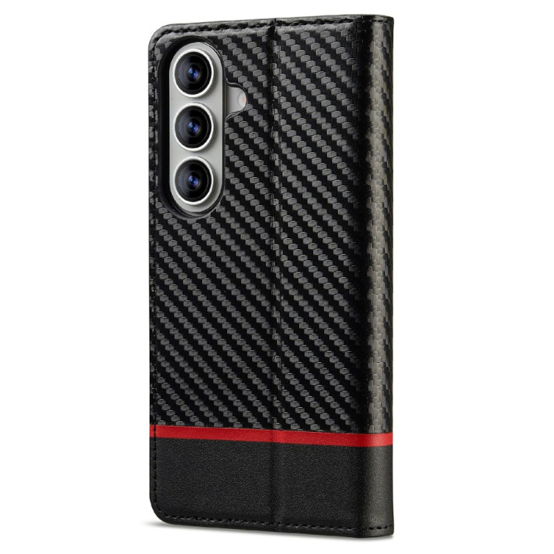 Protégez votre Samsung Galaxy S26 avec cet étui portefeuille élégant. Doté de 3 emplacements pour cartes et d'un compartiment pour espèces, il combine praticité et style. Sa texture fibre de carbone offre une prise en main agréable tandis que son support pliable permet un visionnage mains libres optimal.