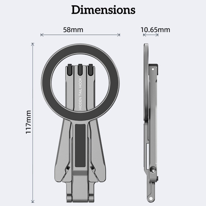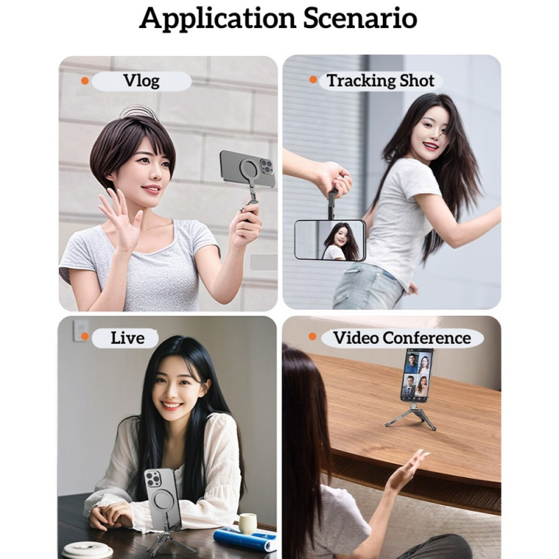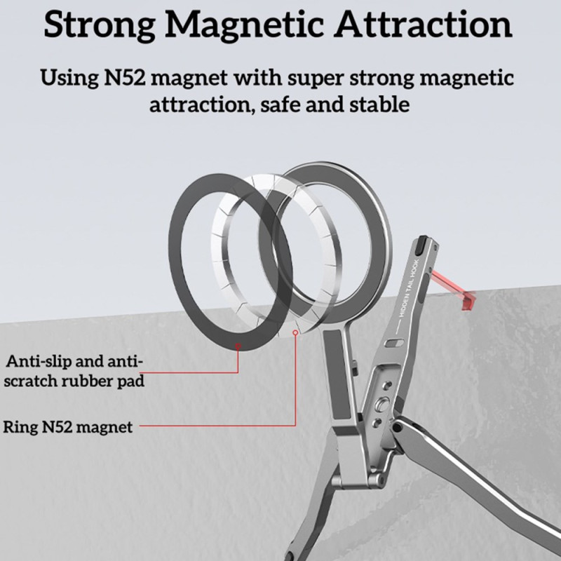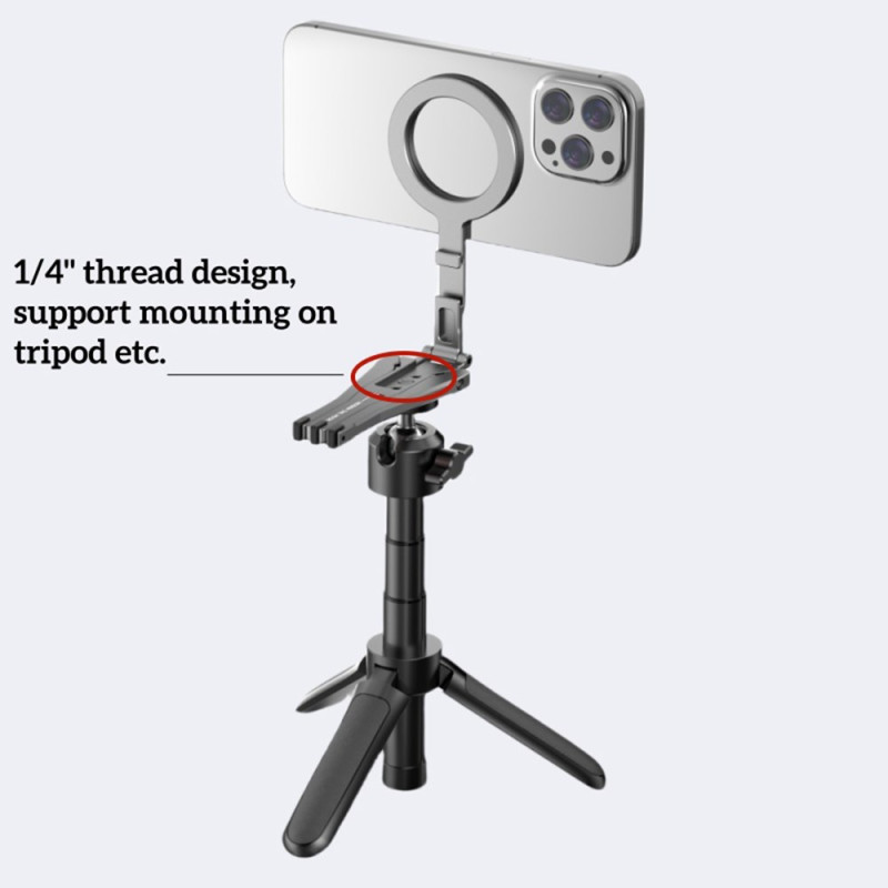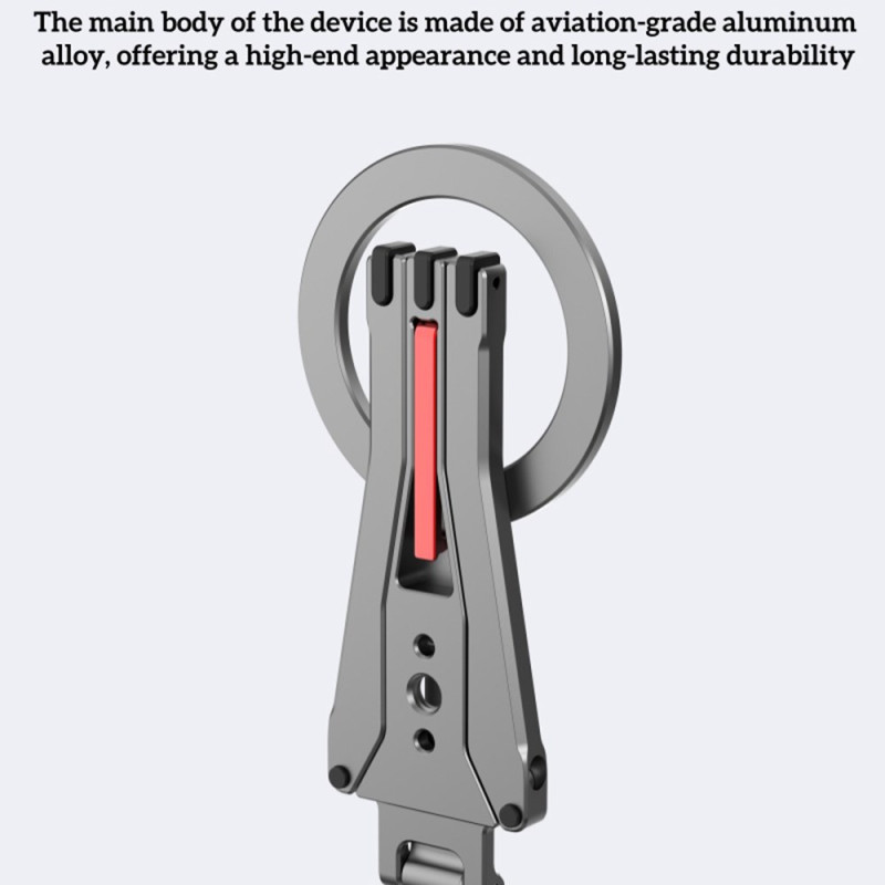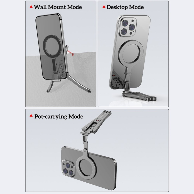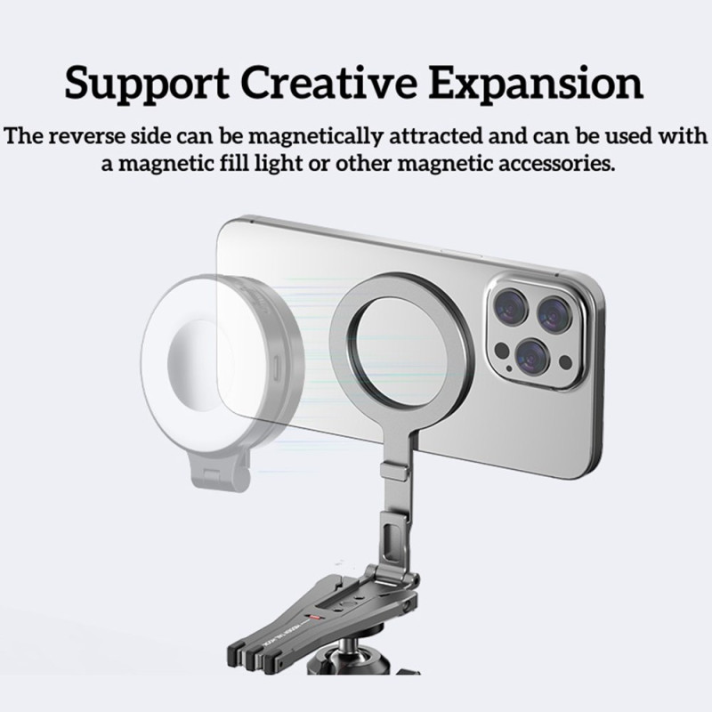 Ce support magnétique est un trépied pliable conçu pour offrir une expérience mains libres polyvalente et ultra-pratique. Compatible avec les iPhone 12 à 16 grâce à l’adhérence magnétique directe ou aux coques MagSafe, il peut également accueillir d’autres smartphones via l’anneau magnétique fourni. Fabriqué en alliage d’aluminium léger et robuste, il intègre des aimants aluminium-fer-bore puissants pour un maintien sûr. Compact une fois replié (117 × 58 × 10,65 mm) et pesant seulement 60 g, il s’utilise comme trépied, support de bureau ou support inclinable selon vos besoins.