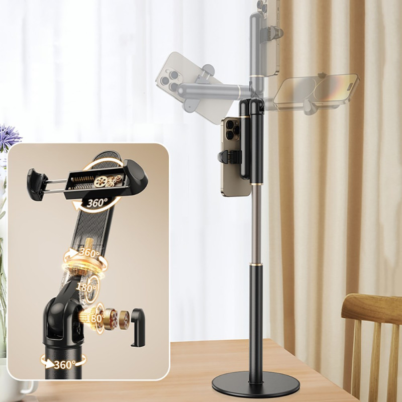 Ce support de téléphone extensible et rotatif est l’outil idéal pour le streaming, la création de contenu ou les visioconférences. Son bras réglable de 53 à 63 cm permet d’adapter facilement la hauteur pour obtenir un cadrage parfait, tandis que la rotule à 360° autorise une bascule rapide entre les modes portrait et paysage. Conçu en acier carbone, alliage d’aluminium et ABS, il offre une excellente stabilité même lors des prises de vue aériennes. Compatible avec les smartphones de 6 à 8 cm de largeur, il s’adapte à la majorité des modèles modernes. Solide et compact, il constitue un support fiable pour un usage quotidien.