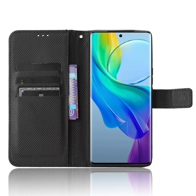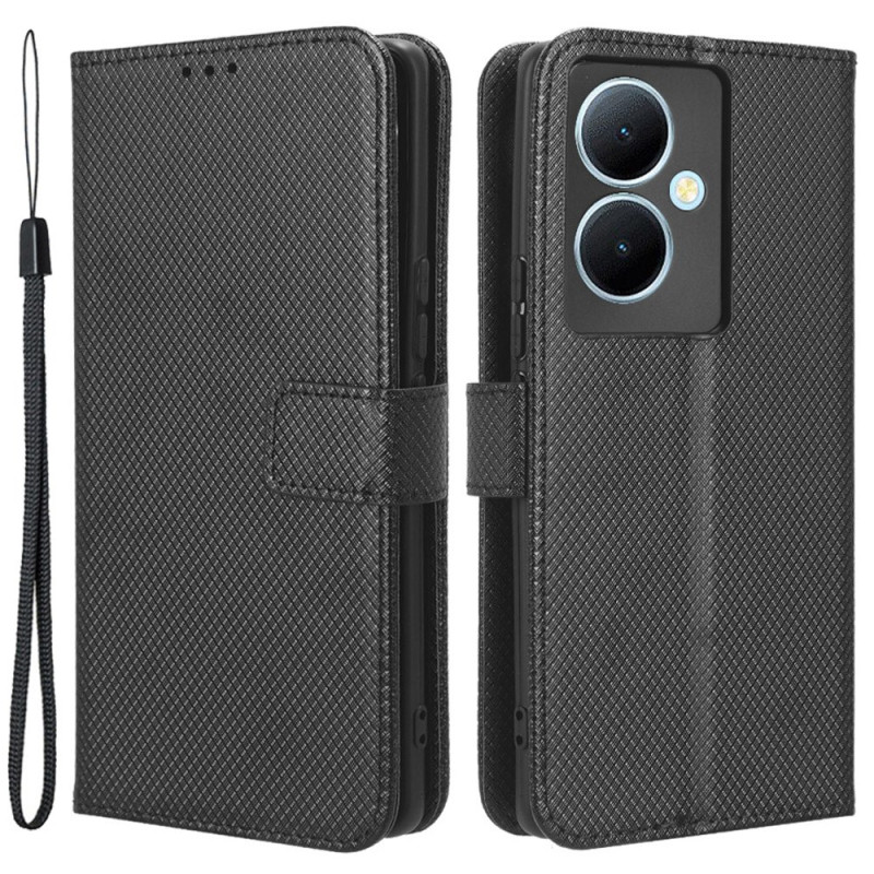 Étui portefeuille élégant avec texture diamant sophistiquée pour votre Vivo V29 Lite 5G. Doté de fentes pour cartes, d'une poche pour espèces et d'un support pliable intégré pour un visionnage mains libres.