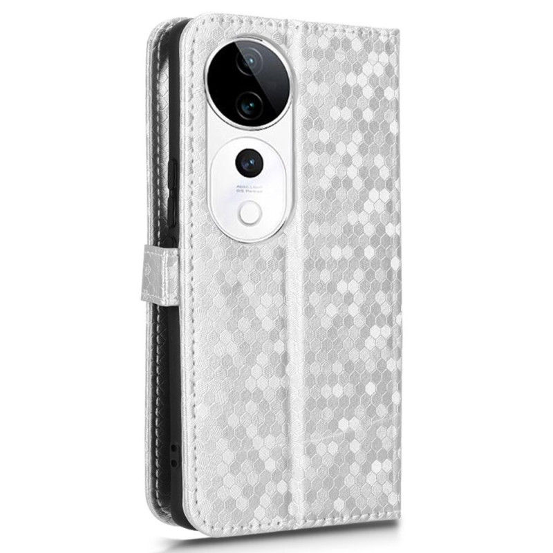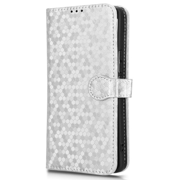 Étui portefeuille élégant en cuir PU avec motif à pois en relief. Fonction support réglable pour un visionnage mains libres optimal. Rangements pour cartes et billets intégrés. Dragonne pratique incluse pour un transport sécurisé.