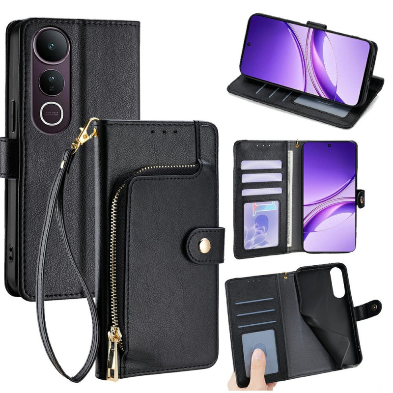 Étui portefeuille multifonction pour Vivo V50 Lite 5G avec texture cire d'huile élégante. Dispose de fentes pour cartes, poche zippée extérieure, support pliable et fermeture magnétique sécurisée. Protection complète contre les chocs et chutes.