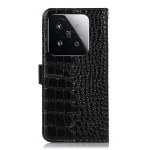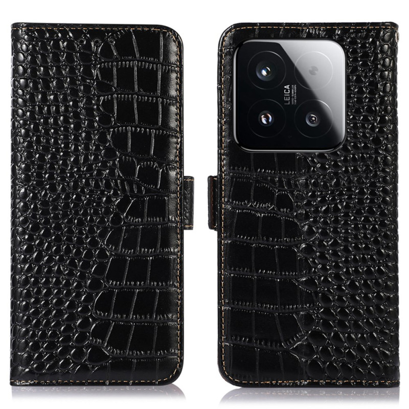 Housse portefeuille en cuir véritable pour Xiaomi 15T avec technologie RFID. Texture crocodile élégante, 3 emplacements pour cartes, poche pour billets et support intégré. Protection complète contre les chocs et les rayures. Fermoirs magnétiques pour une sécurité accrue.