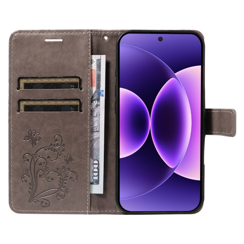 Étui élégant en cuir PU avec motif papillon imprimé, offrant une protection robuste et des fonctionnalités pratiques. Comprend des emplacements pour cartes, un compartiment pour billets, une fonction support et une dragonne pour une portabilité accrue.