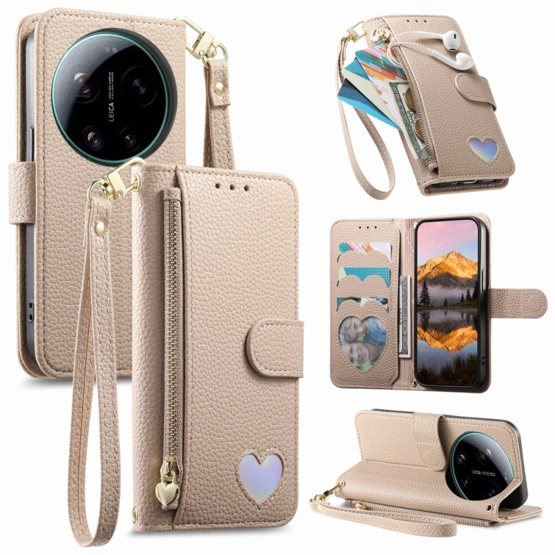 Étui portefeuille élégant pour Xiaomi 17 Ultra 5G en cuir PU premium avec motif cœur. Comprend une fermeture éclair, des compartiments pour cartes et espèces, un support pliable et une dragonne. Protection complète avec fermeture magnétique sécurisée.