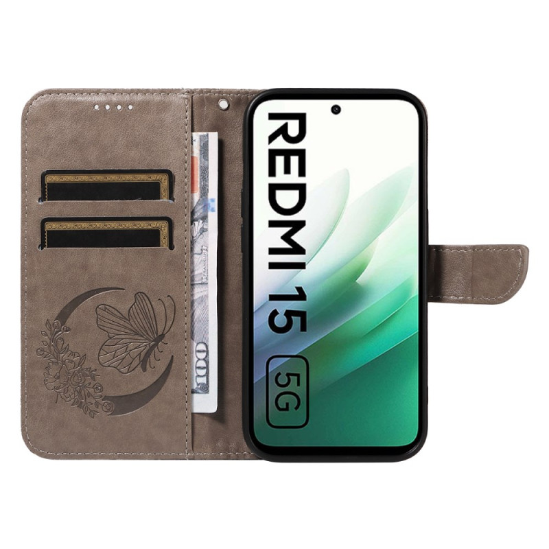 Étui en cuir PU de haute qualité avec motif papillon pour Xiaomi Redmi 15 4G. Offre une protection robuste et élégante avec des fonctionnalités pratiques comme des emplacements pour cartes, un compartiment portefeuille et une fonction support. Parfait pour allier style et fonctionnalité.