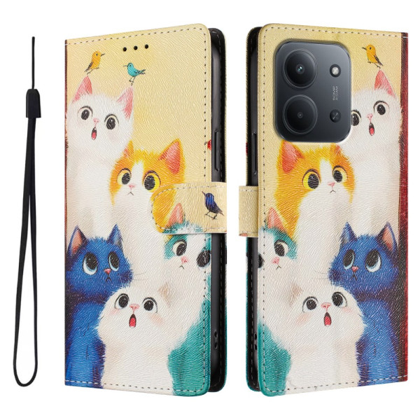 Protégez votre Xiaomi Redmi 15C 5G / 5G avec cet étui portefeuille élégant et fonctionnel. Doté d'un motif de chats colorés, il offre une protection durable, des fentes pour cartes, une fonction support et une dragonne détachable. Alliant style et praticité, cet étui en cuir PU avec coque TPU intérieure assure une protection complète contre les chutes et les rayures.