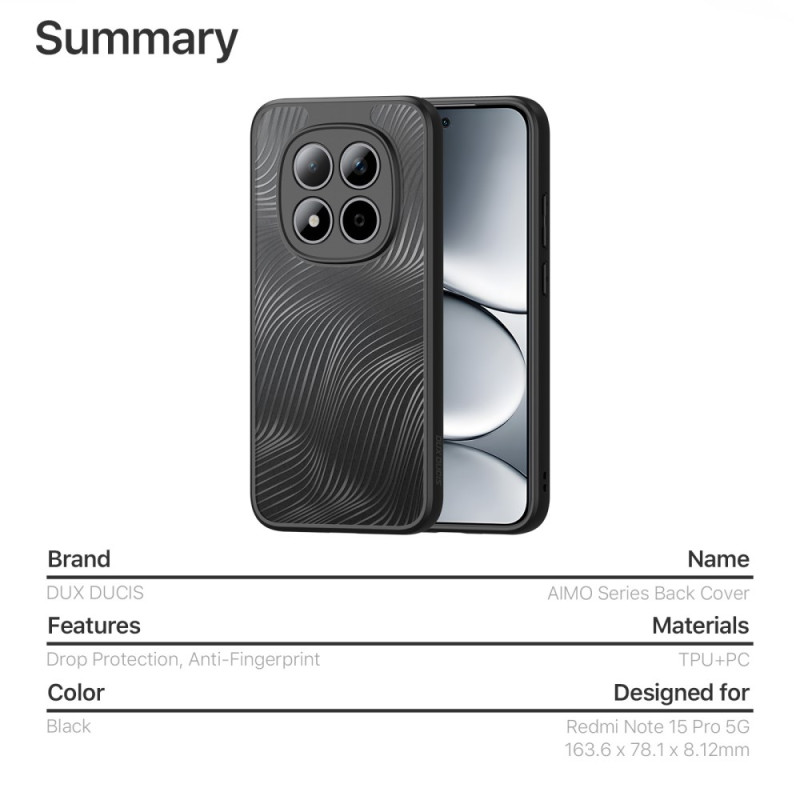 Protégez votre Xiaomi Redmi Note 15 Pro 5G avec élégance grâce à la coque DUX DUCIS Aimo. Certifiée REACH, cette coque anti-chute allie design sophistiqué et protection renforcée. Sa finition mate et ses lignes fluides offrent une prise en main...